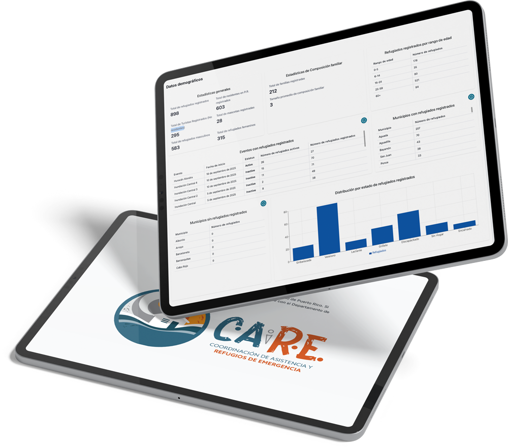 La plataforma CARE (Coordinación de Asistencia y Refugios de Emergencia) es un sistema digital del Gobierno de Puerto Rico que centraliza la gestión de refugios y agiliza la respuesta ante emergencias. Permite a las agencias acceder en tiempo real la información sobre capacidad, recursos y estado operativo de los refugios, además de registrar digitalmente a las personas que los utilizan. También busca integrarse con otros sistemas gubernamentales para mejorar la coordinación y eficiencia en situaciones de desastre.